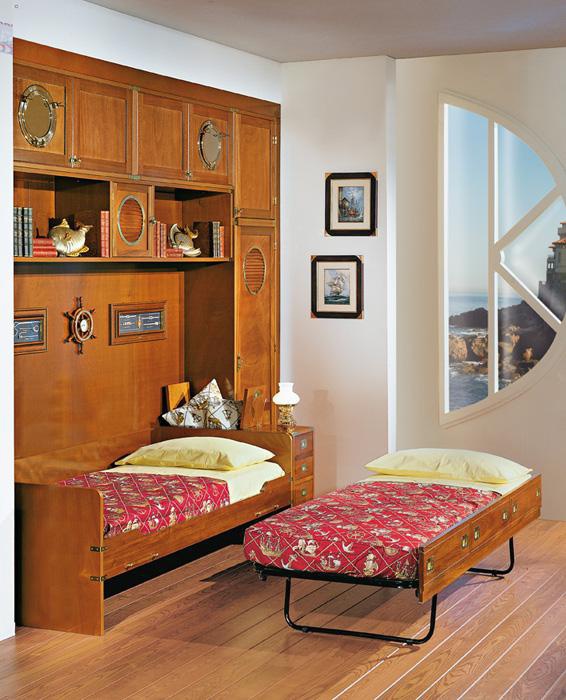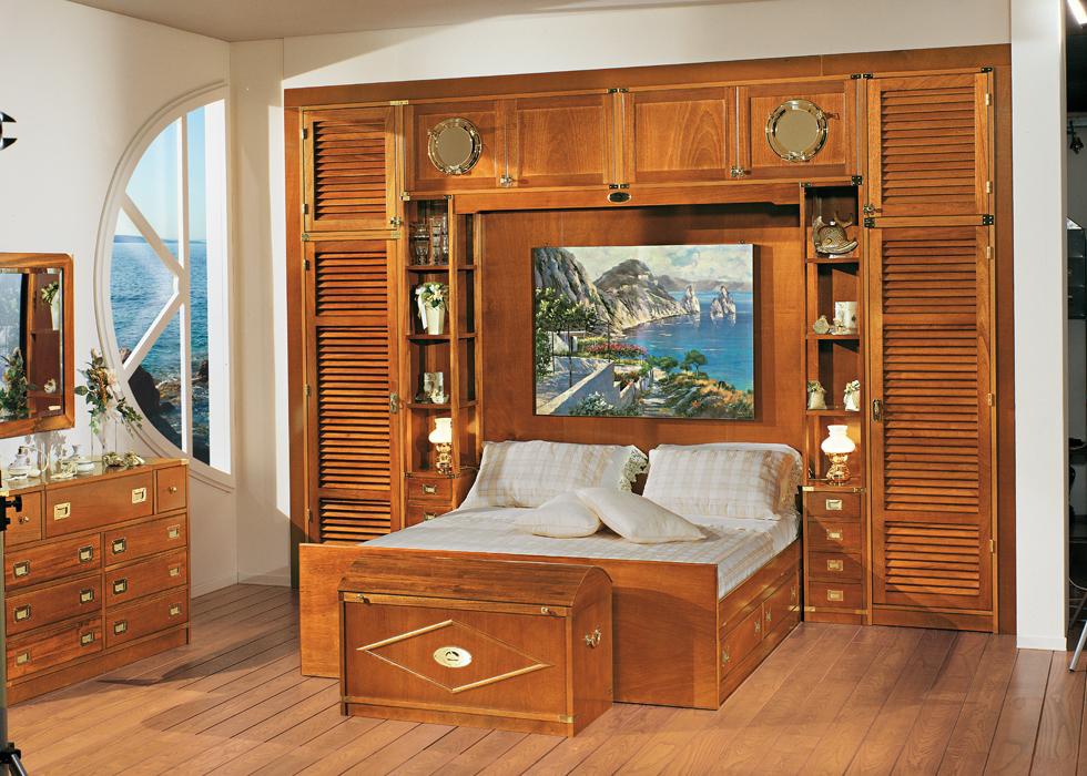 Set Maria Vecchia from the Italian manufacturer Caroti. This headset presents the model of the Cabinet with double doors and shelves, double bed with bedside tables provided. Presents a dresser with drawers and rectangle mirror. Color light natural mahogany. The multifunctional design complements the chest. The perfect solution for bedrooms in a nautical motif.