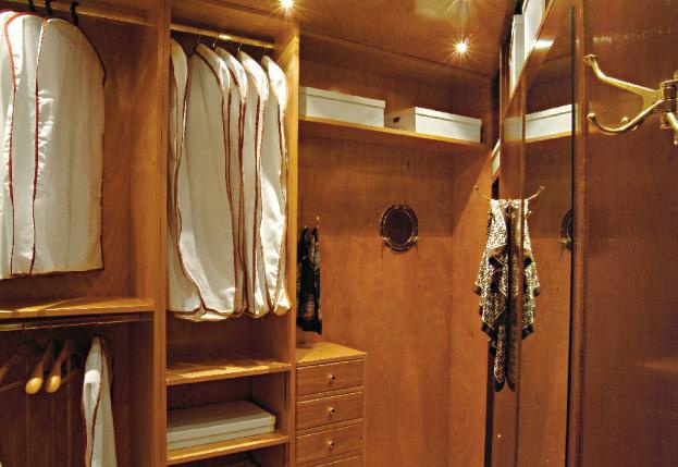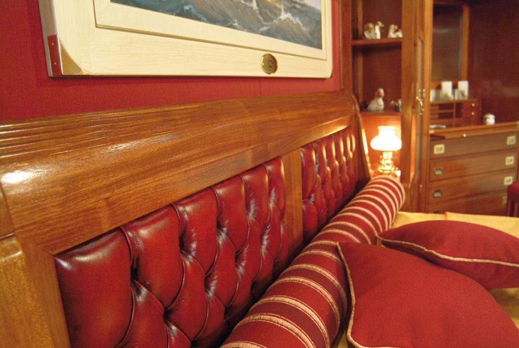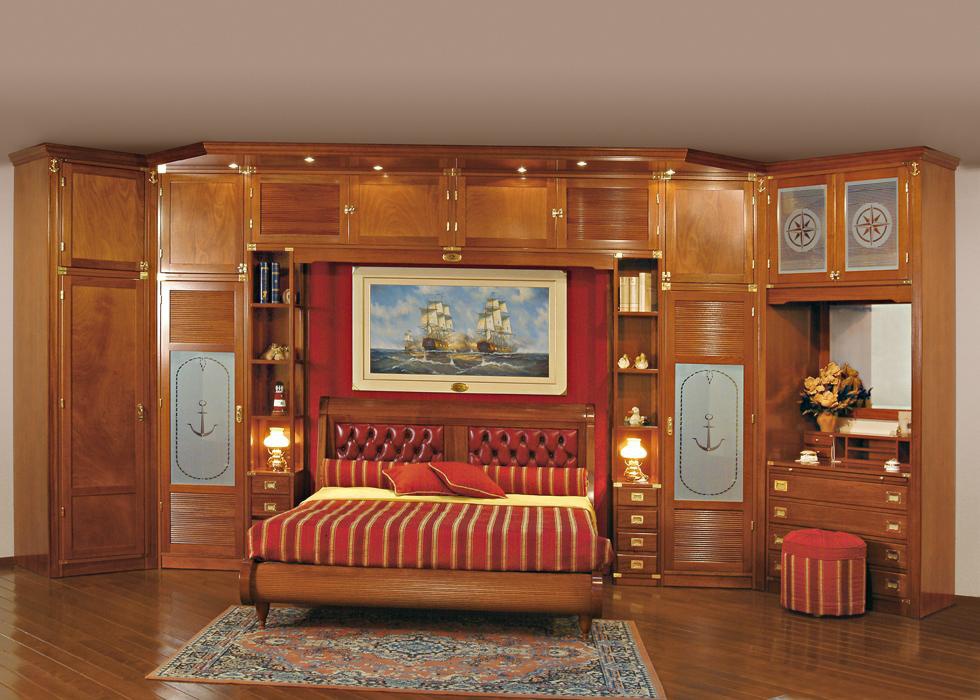 Headsets for bedroom with storage Vecchia Maria Caroti Italian manufacturer. Set includes a large, functional walk-in closet corner for storage, open shelving and a double bed. Headboard upholstered in leather with decorative stitch Capito, colors to choose from a range of companies. The furniture is made of mahogany, natural tone. Great functional and aesthetic solution for your bedroom in nautical style.