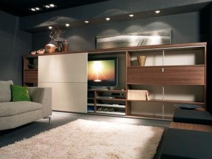 Wardrobe from the German manufacturer Kettnaker. The model includes open shelves, partitions with sliding doors and space for TV. Material - solid wood. The finish offers a glossy lacquer from the collection company.