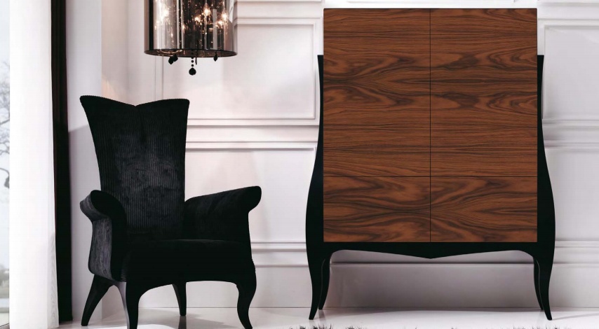 High buffet Abril collection from the Italian manufacturer Mobil Fresno. The frame is made of wood. Finishing varnish from the company portfolio. Colors - black and brown. A snack bar made with two doors. The model is made in modern style.