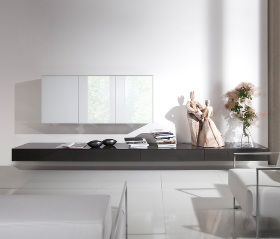 Modular system from the German manufacturer Kettnaker. Includes mounted and floor modules of different sizes. Frames made from solid wood. Surface treated high gloss lacquered white and grey. Different capacity and modern design.