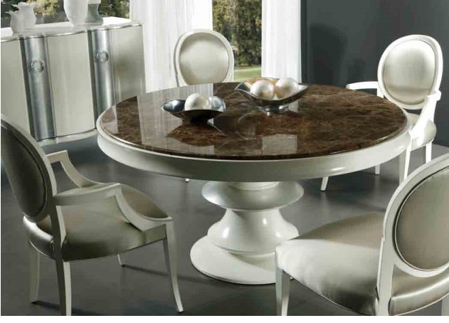 Set for the dining room Savoy collection from the Italian manufacturer Mobil Fresno. Set includes dining table, chairs with armrests. The frames are made of wood. The finishing - varnish. Cveta gamma brown and white. Worktop - round. Upholstery - textiles. Set is made in modern style.