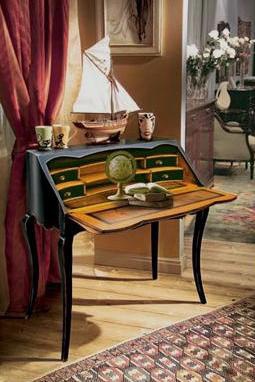 Secretaire from the Italian producer Giorgio Piotto. The frame is made of wood, painted black and varnished. Inside the secretaire light brown color, panel boxes green. The model is executed in classical style.