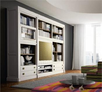Modular storage system from Spanish manufacturer La Ebanisteria. The body is made of solid wood. Finish options presented in the company's range. Module for books and TV. Wall with open shelves and drawers. Great selection for modern interiors. Product color white.