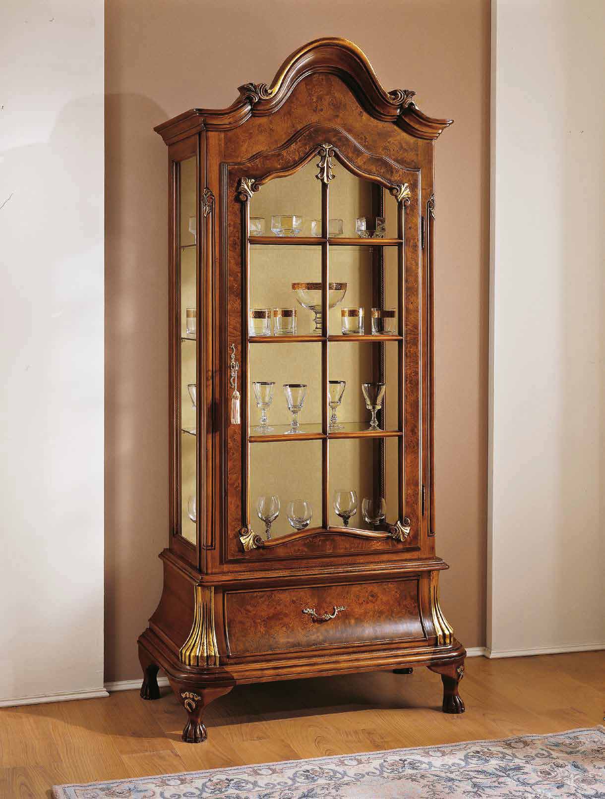 Showcase in classical style from the Italian manufacturer Scappini & C. For the manufacture of the frame is made from solid wood of valuable breeds. Model on legs with the completion of the "hairy paw", one door. Showcase one door with three removable shelves and a drawer. The product is decorated with a carved and patterned metal inserts gold color. The door closes with a key.