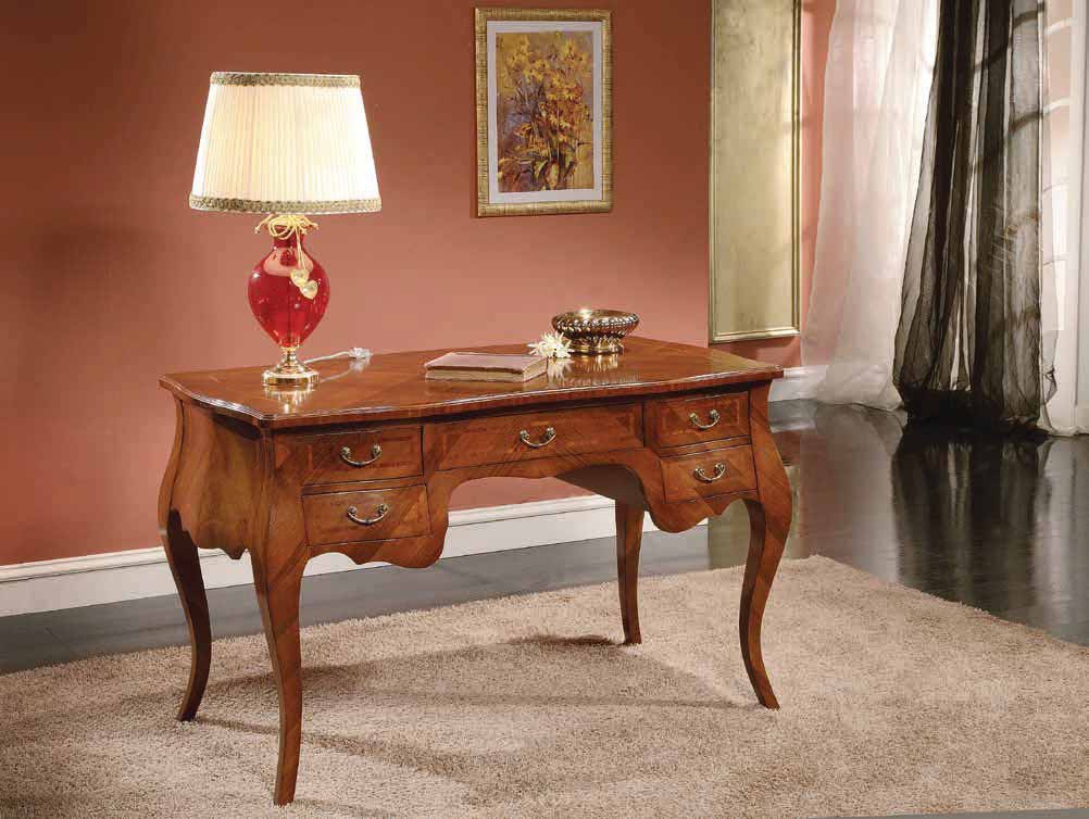 Desk from the Italian manufacturer Scappini & C. For the manufacture of the frame is made from wood of valuable breeds. The model is presented in brown color, decorated with inlays. Table with five drawers. Made in the classic style.