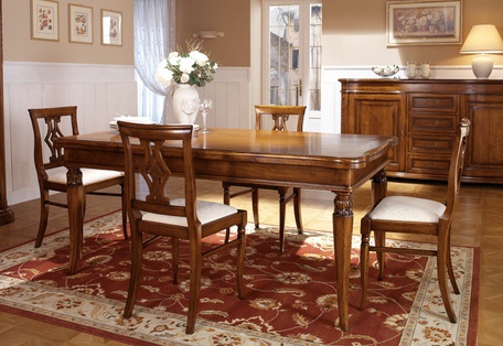Set for the dining room from Italian manufacturer Mascotto. Set includes dining table with rectangular table top, chairs, sideboard. The frames are made of wood. Upholstery - textiles from the company portfolio. Accessories metal. Offers a glossy finish or a matte varnish.