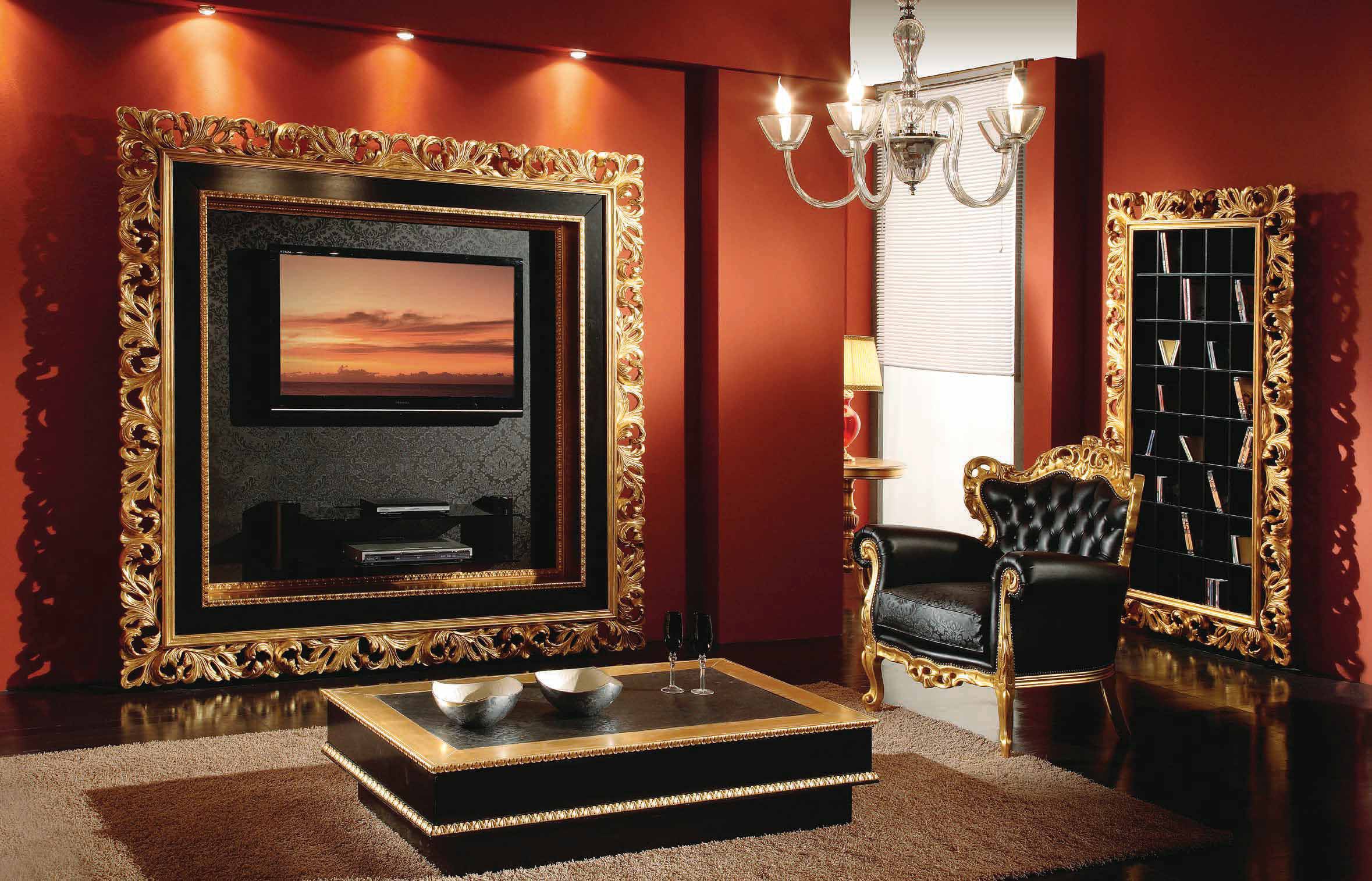 Furniture for TV from the Italian manufacturer Scappini & C. For the manufacture of the frame is made from wood of valuable breeds. The model in the form of a large carved frame with mounts for TV and one shelf. The bookcase will perfectly complement a living room in Baroque style.