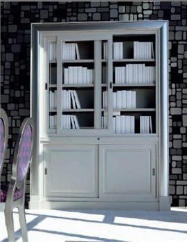 Bookcase from Spanish manufacturer La Ebanisteria. The frame is made from solid wood. The surface is treated with white varnish. The doors are sliding. The bottom section blank, top is in glass. The facade is decorated with decorative frame in silver. Great selection for modern interiors.