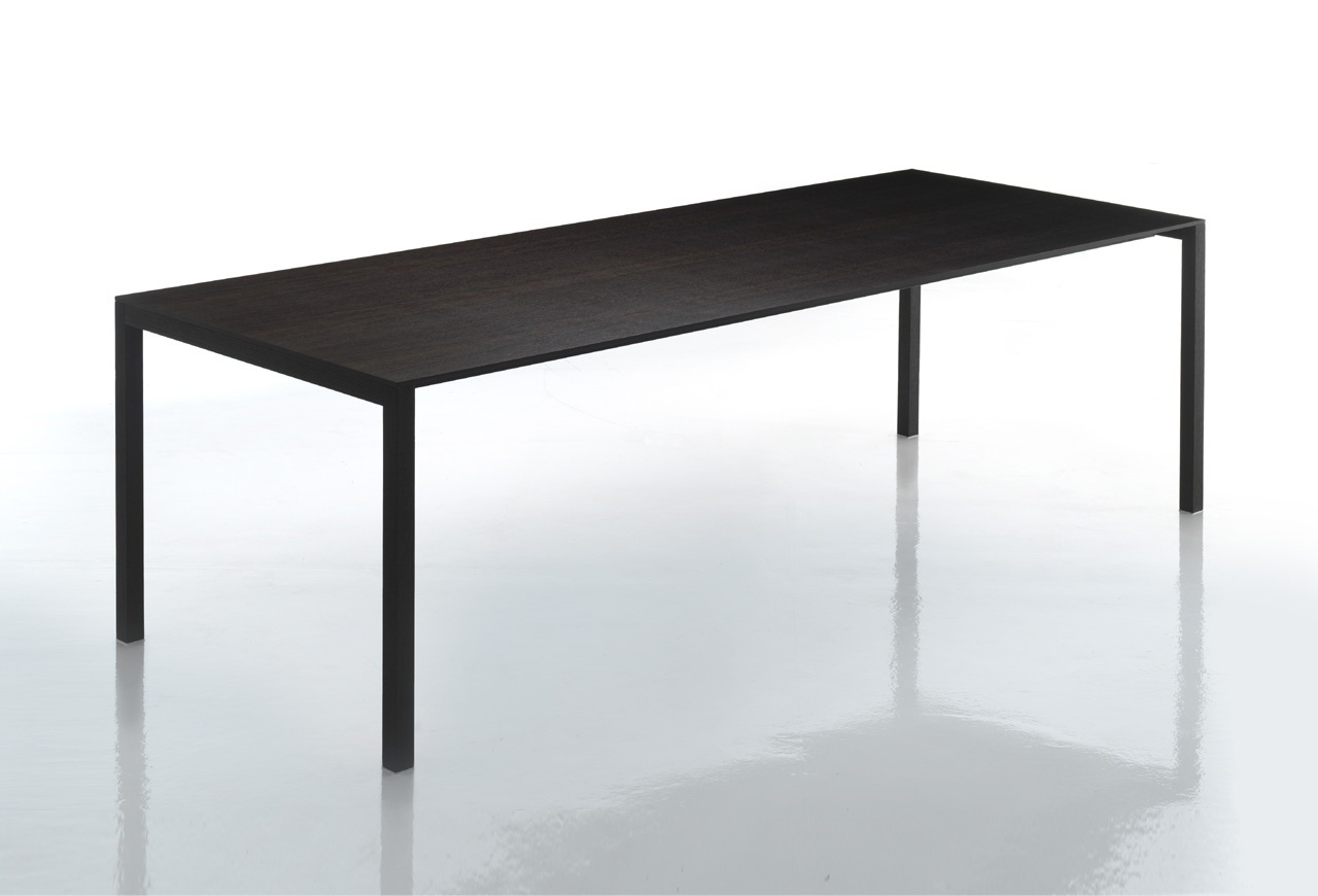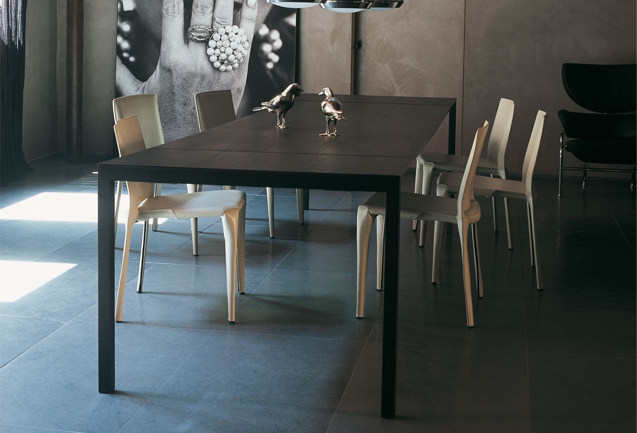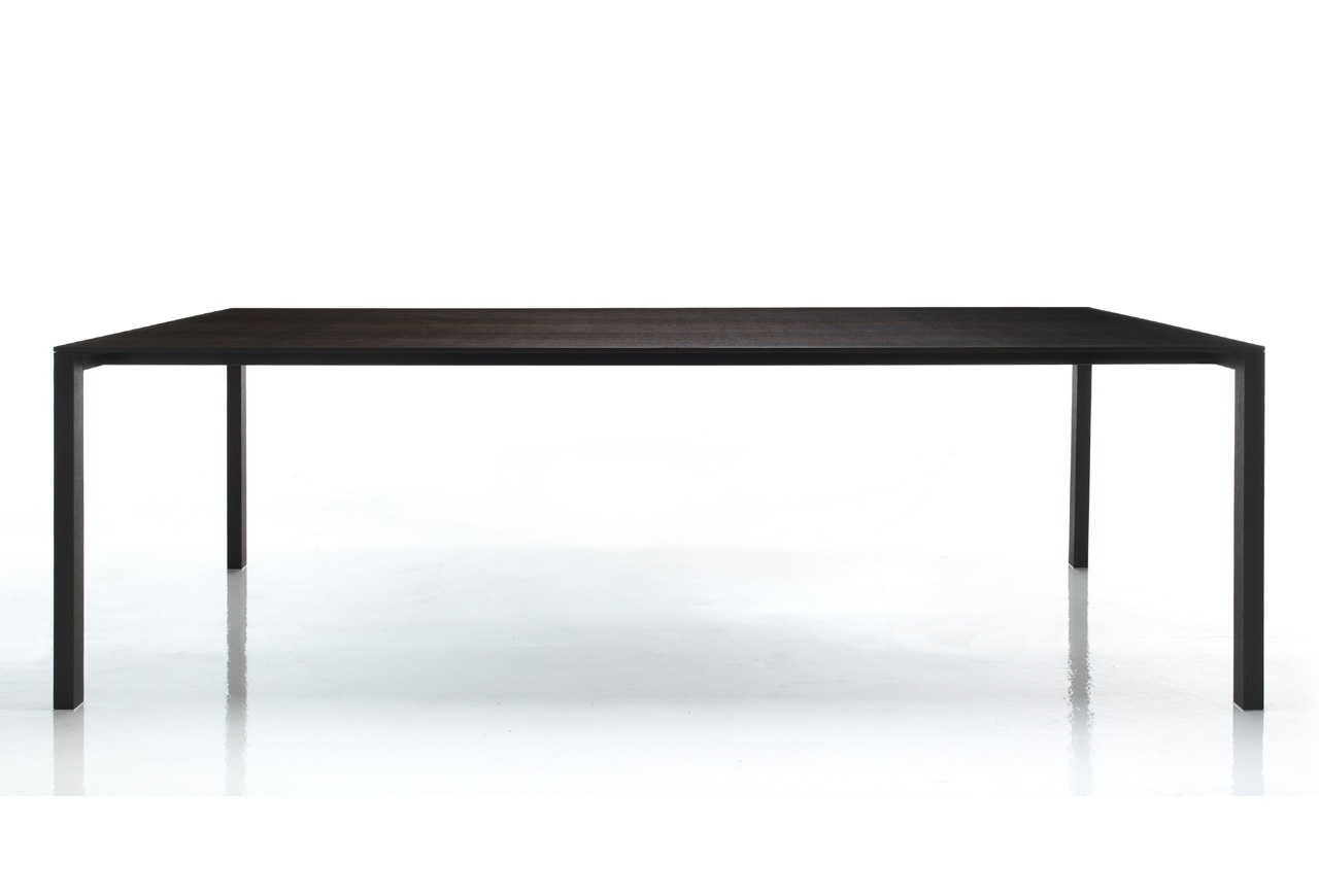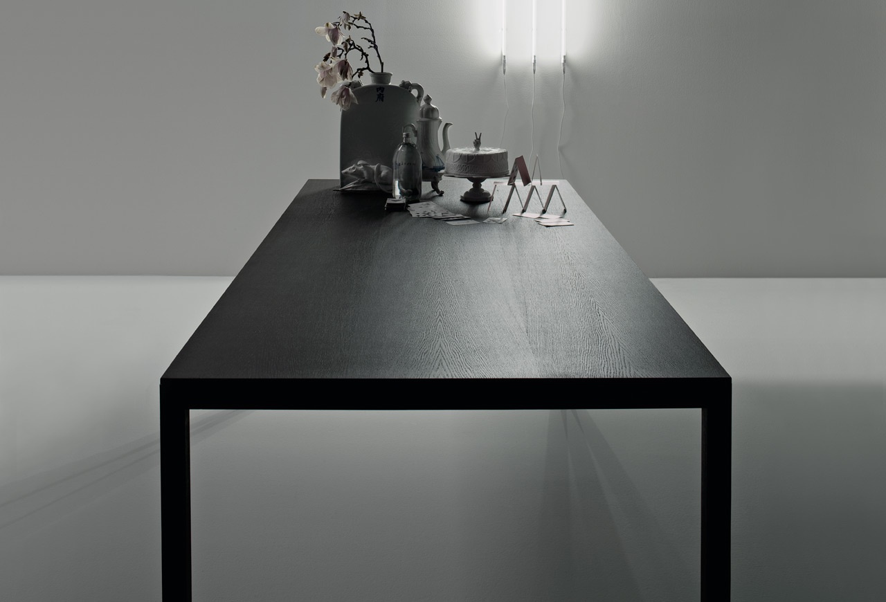 Dining table 195 NAAN from the Italian manufacturer Cassina. Rectangular table with fixed or extendable top in natural oak, smoked oak, American walnut, white or black stained ash. Stability is ensured by an internal anchoring system nested in the thin aluminium legs wrapped in wood. A lovely choice for dining room design decoration.