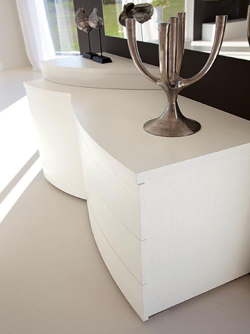 Chest Opera from the Italian manufacturer Saber, a collection of Luxury. The frame is white, made from ash wood with "open pore", decorated with a band of shiny steel. The model has smooth closing system of drawers, with integrated blum motion guides. The product stands out with a soft design made in modern style.