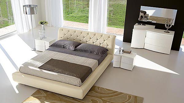 Bed Vision from the Italian manufacturer Saber, a collection of Luxury. The frame is made of solid ash, upholstered in leather cream color. The bed on the podium, with soft padded headboard. The model is made in modern style.