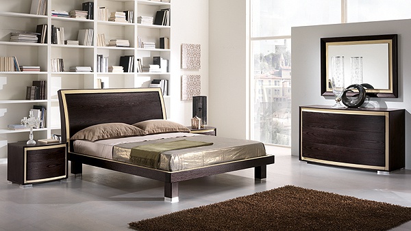 The Fusion bed from Italian manufacturer Saber, a collection of Luxury. The frame is made of solid ash coffee color, decorated steel inserts, Golden or silver color. Model with high headboard on square legs with metal end. The product is designed in modern style.