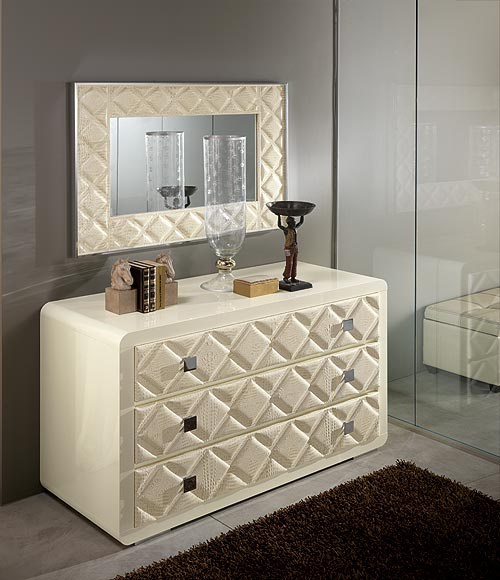The Elite dresser rombi from the Italian company Saber, a collection of Luxury. The frame is made of solid ash, cream or white. The surface is lacquered. Panel boxes decorated with crocodile skin, the same colour as the frame. Metal fittings, decorative. Model c curved and contemporary design.