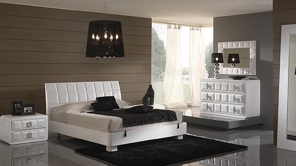 Skyline bed from Italian manufacturer Saber, collection Evolution. The frame is made from solid wood. Headboard with white skin, crocodile, checkered pattern. The model is presented in white color, the surface is lacquered. The bed is designed in modern style.