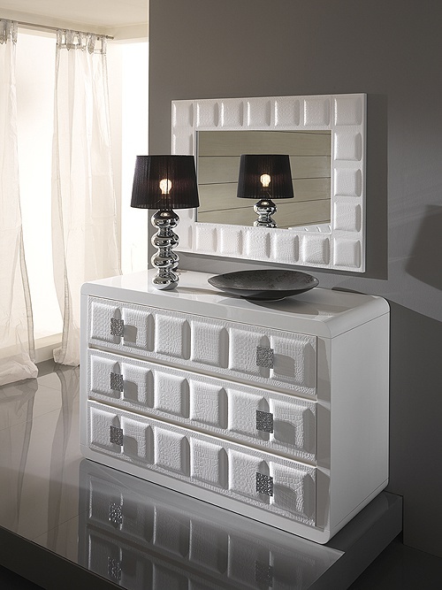Chest of drawers from the Elite Italian company Saber, collection Evolution. The frame is made from solid wood. Model white color, varnished. Panel boxes finished with a white skin. Pens decorated with Swarovski crystals. The dresser has smooth shapes and modern design.