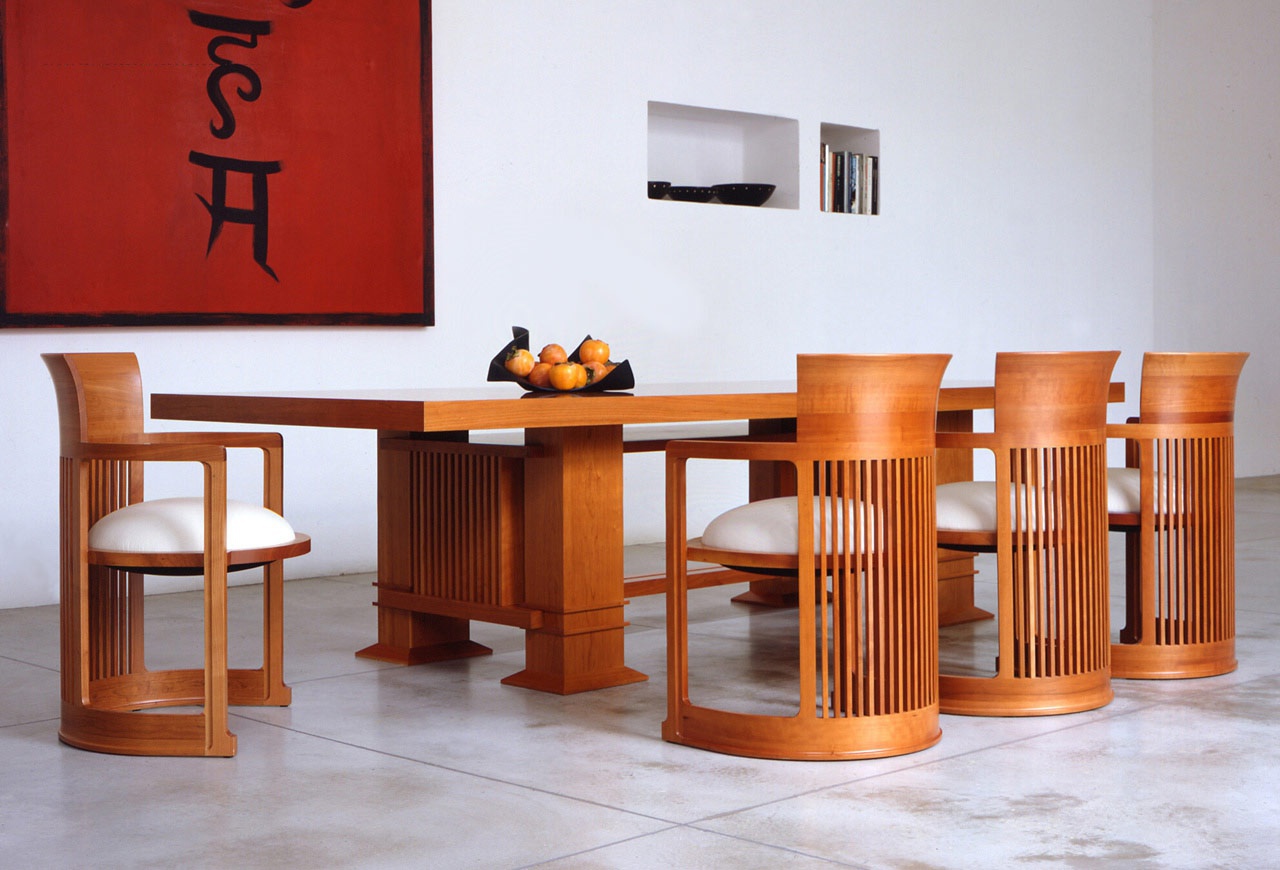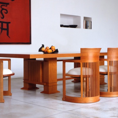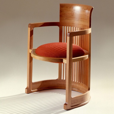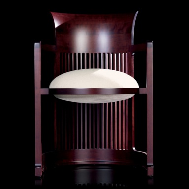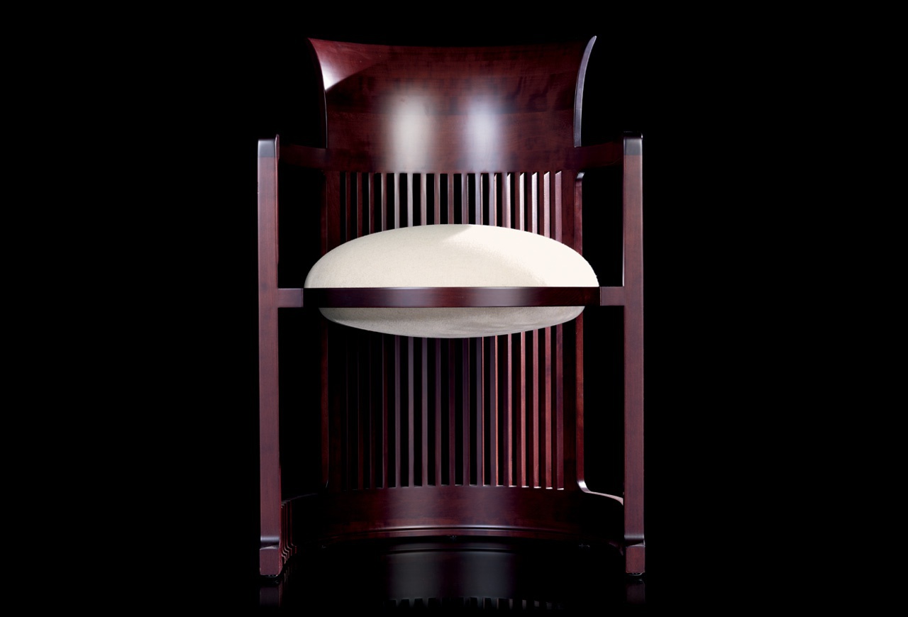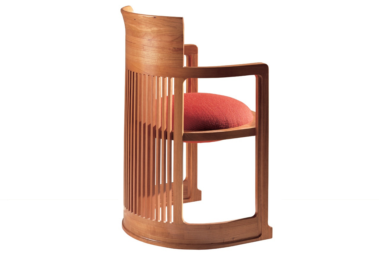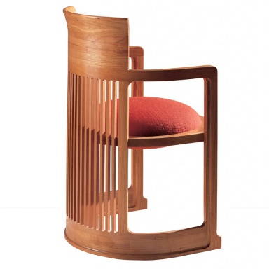 606 BARREL chair from the Italian manufacturer Cassina. Designer - Fran Lloud Wright. The frame is made from solid cherry, filler - foam, upholstery - leather or fabric from the company portfolio. The model with armrests. The back is semi-circular. Colors: natural wood color, seat cover in stock.