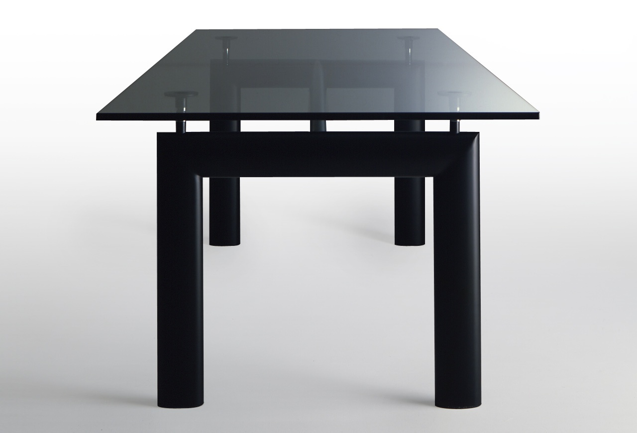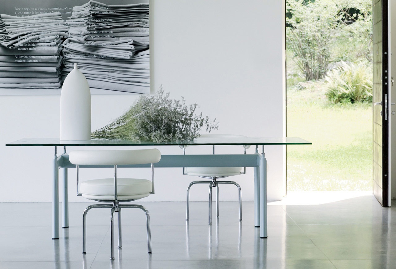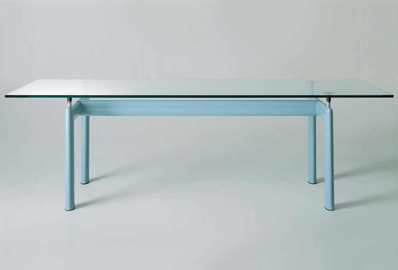 Dining table LC6 LIMITED EDITION on a metal frame from the Italian manufacturer Cassina. Design by Le Corbusier, Pierre Jeanneret, Charlotte Perriand. The frame is made of steel, worktop - glass. A good choice for dining room design decoration. Colours in stock.