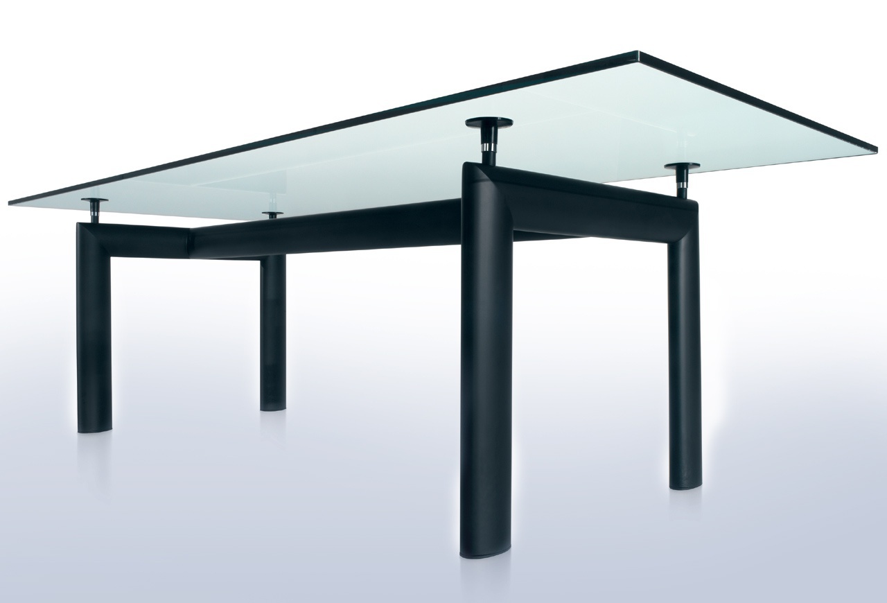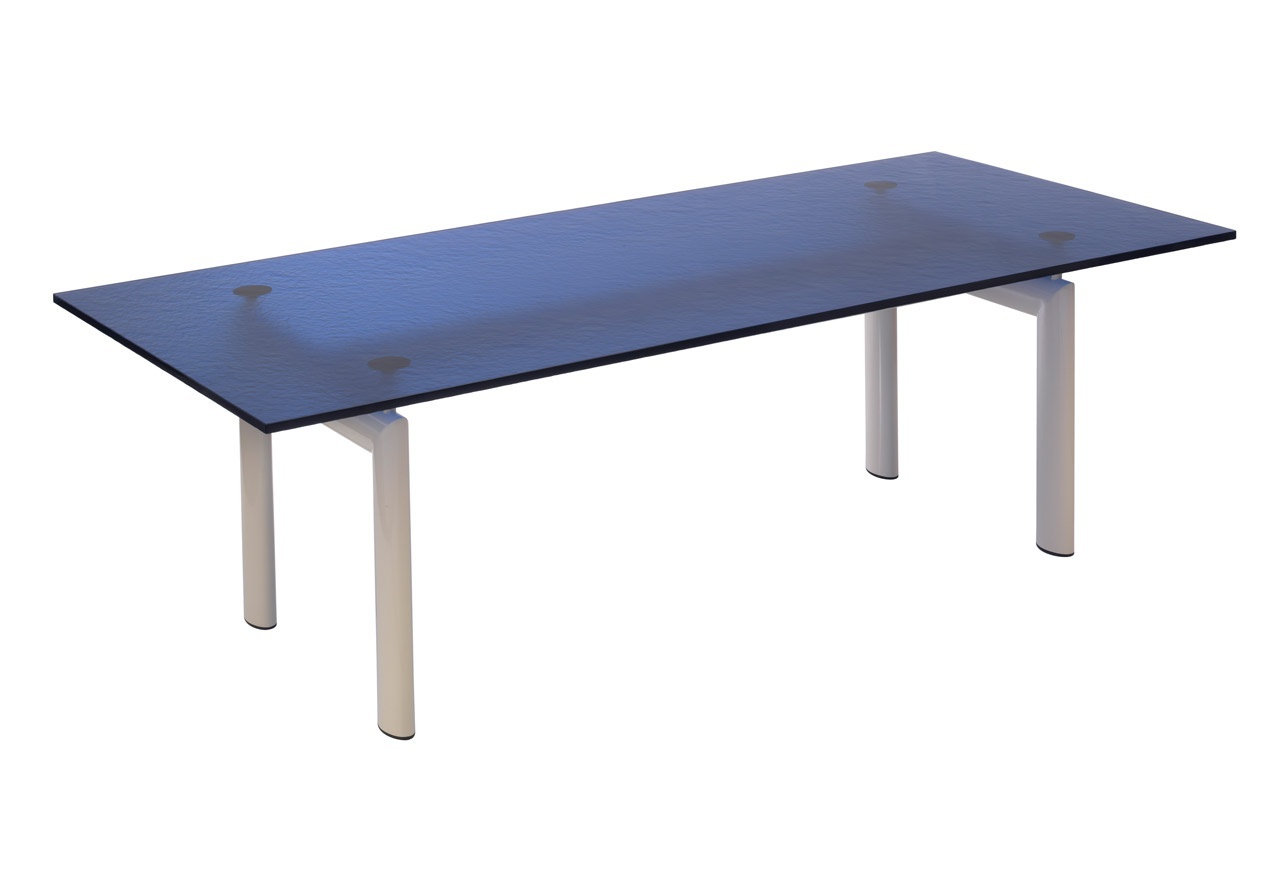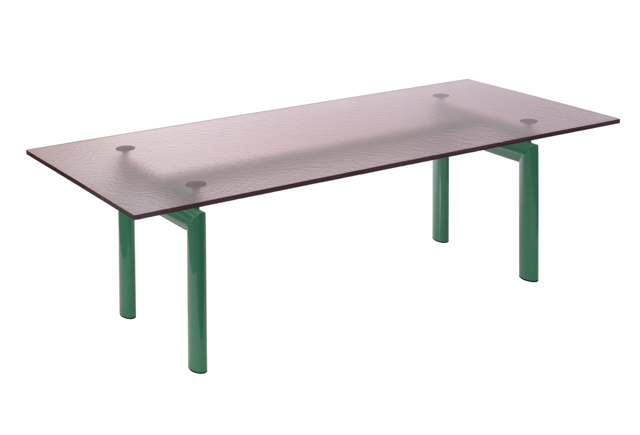 Dining table LC6 LIMITED EDITION on a metal frame from the Italian manufacturer Cassina. Design by Le Corbusier, Pierre Jeanneret, Charlotte Perriand. The frame is made of steel, worktop - glass. A good choice for dining room design decoration. Colours in stock.