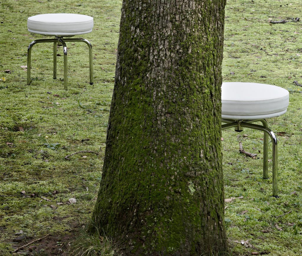Stool with metal frame OUTDOOR LC8 from the Italian manufacturer Cassina. Design by Le Corbusier, Pierre Jeanneret, Charlotte Perriand. The frame is made of steel, filler - foam, upholstery - leather or fabric from the company portfolio. The rotating seat. Colours in stock.