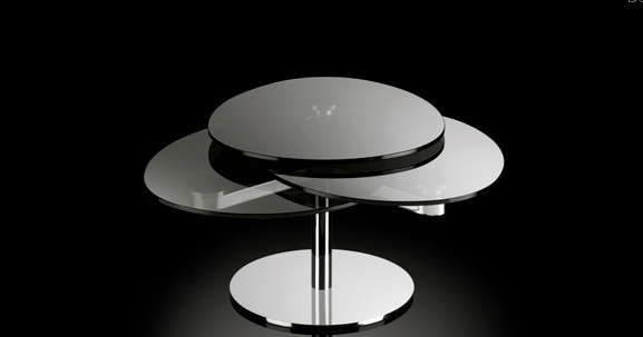 Flamenco cocktail table from the Italian manufacturer Naos. Countertops made of glass. The base is steel painted or galvanized. The base is equipped with a mechanism for synchronized rotation of the tops. The model is made in modern style.