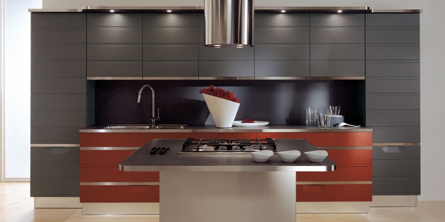 Traccia kitchen set from the Italian manufacturer Novalinea. The frame is made of wood and metal. The kitchen is designed with a bright personality. Finish - Matt lacquer, the range of the company. Colours - grey, red and white. The model is made in modern style.