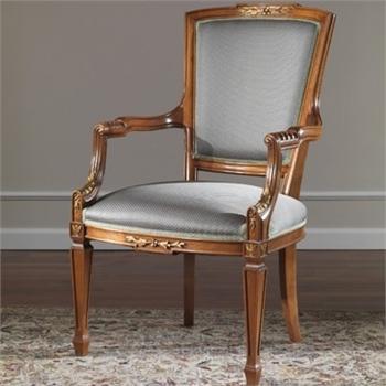 A chair from the Italian manufacturer Colombo Mobili. The frame is made of wood, upholstery - textiles from a range of campaigns. Carved decorations in gold leaf. The armrests hard. Excellent choice for a dining room in classical style. Colors: natural wood color, grey.