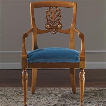 A chair from the Italian manufacturer Colombo Mobili. The frame is made from solid wood and finished in cherry, seat cover - fabric from a range of campaigns. The armrests hard. The back is decorated with handmade carving. A great choice for the interior in classic style. Colors: natural wood color, blue.