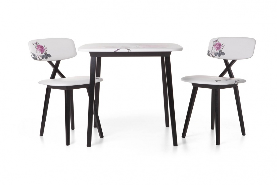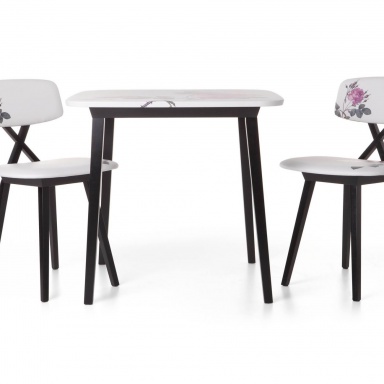 Table 5 O'clock from the Dutch manufacturer Moooi. The base of the table is made from solid beech worktop from MDF, upholstered in fire retardant faux leather with floral print. The model square. Additionally, you can order the chairs from this collection. A lovely choice for interior design.