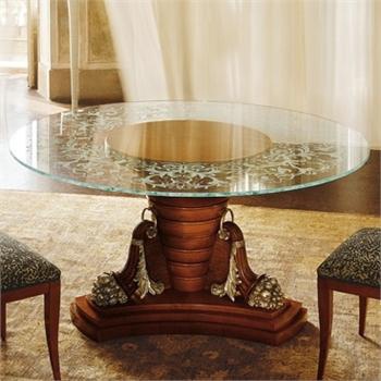 Dining table from Italian manufacturer Colombo Mobili. The base is made from solid wood, the table top is clear glass. The model is decorated with hand-carved with leaf accents in silver. Model round shape. A lovely choice for a dining room in classical style. Colors: transparent, natural wood color, brown.