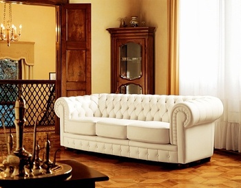 Diamant sofa from Italian manufacturer Spagnol Group. Upholstery - leather or leatherette. The backrest and armrests decorated with stitch-Capito. Gorgeous triple model for the living room in a classic style. Product color ivory.