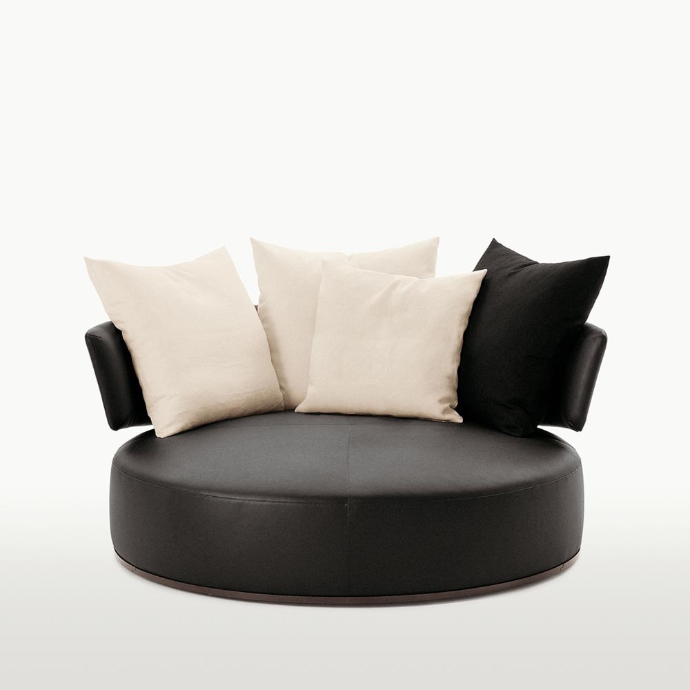 Round Amoenus armchair from Italian manufacturer Maxalto. The frame is made of metal. Low plastic legs. Upholstery leather or textile from the company portfolio. The filler is not deformable polyurethane foam. Complement the design of decorative pillows.
