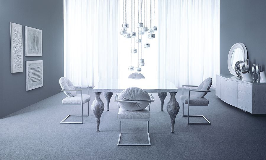 Set for the dining room from Italian manufacturer Ego. Set includes dining table and chair. The furniture is made of solid wood and metal. Worktop - glass. Upholstery - leather or textiles from a range of campaigns. Colours in stock.