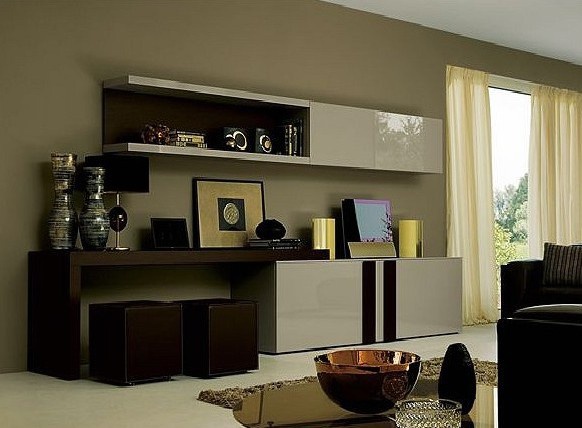 Modular storage system from Italian manufacturer San Giacomo. The frame is made from solid wood, the surface is treated with varnish from the range of the campaign. Module for books and heavy things. Wall with double doors, open shelves and built-in table. A lovely choice for the living room in a modern style. Colours in stock.