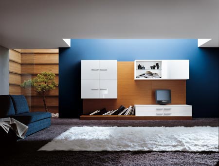 Modular storage system from Italian manufacturer San Giacomo. The frame is made from solid wood, the surface is treated with varnish from the range of the campaign. Module with space for TV, open shelves and closed sections. A perfect choice for a living room in modern style. Colors: natural wood color, white.