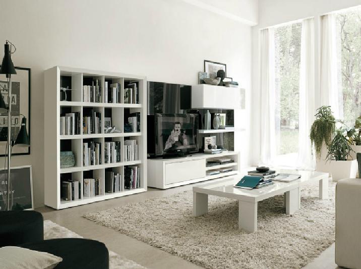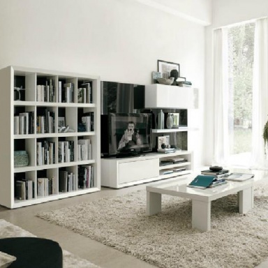 Modular storage system from Italian manufacturer San Giacomo. The frame is made from solid wood, the surface is treated with a varnish of white color. Model for books and TV. Wall with open shelves and closed sections. A great choice for living room in modern style.