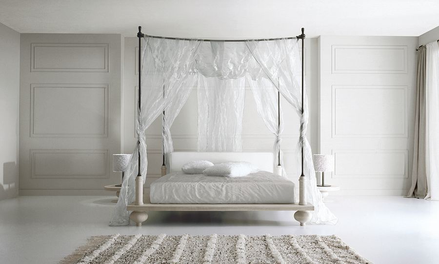 The four-poster bed and upholstered headboard Marrakech from the Italian manufacturer Ego. The frame is made from solid wood and metal. Colours in stock. The model is made in modern style.