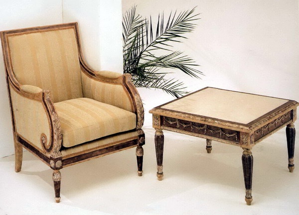 Sofa set from the Italian manufacturer Stil Decor. Set includes a chair with a removable seat and coffee table in square shape. The furniture is made of solid wood. Seat cover - fabric from a range of campaigns. The model is decorated with decorative carvings. D?cor - gilding. Set in a classic style. Colours in stock.