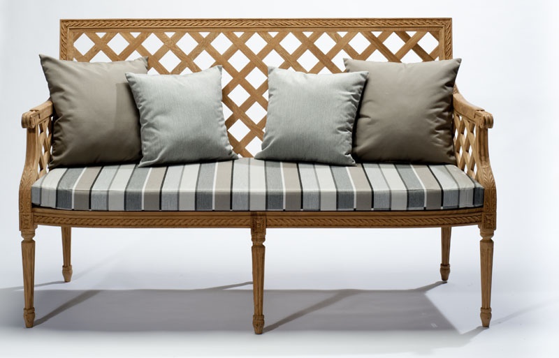 A double sofa from Belgian manufacturer Massant. Body and legs made from solid wood. Seat covered with textiles from the collection of the company. The filler is not deformable polyurethane foam. Hard back complemented with soft cushions. Decoration is the decorative carving handmade.