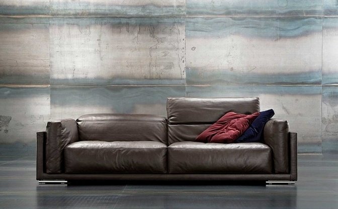 Two seater sofa from the Italian Spazio Erba Italia manufacturer. The frame is made of wood. Upholstered in leather from the company portfolio. Colors - dark brown. The legs are made of metal. Back transformed. The model is made in modern style.