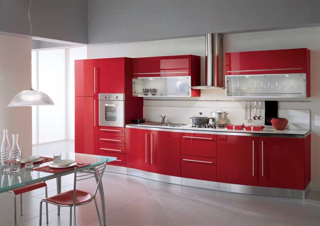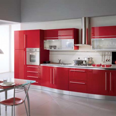 Set for the kitchen from Fiamberti Italian production. Set in a contemporary style. The base is made from aluminum. The working area is of stainless steel and glass. Door - blind/glass. The surface is treated with varnish from the range of the campaign. Kitchen with built-in illumination. Colors: white, red.