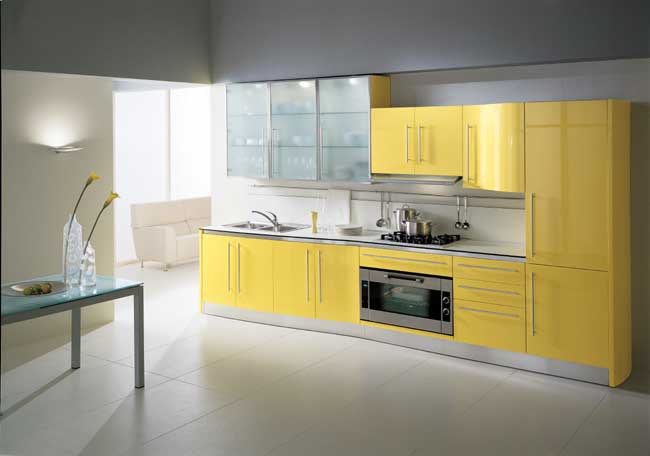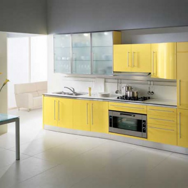 Set for the kitchen from Fiamberti Italian production. The base is made from aluminum. The frame is made from solid wood. The surface is treated with varnish from the range of the campaign. Door - blind/frosted glass. Kitchen with built-in illumination. Colors yellow.