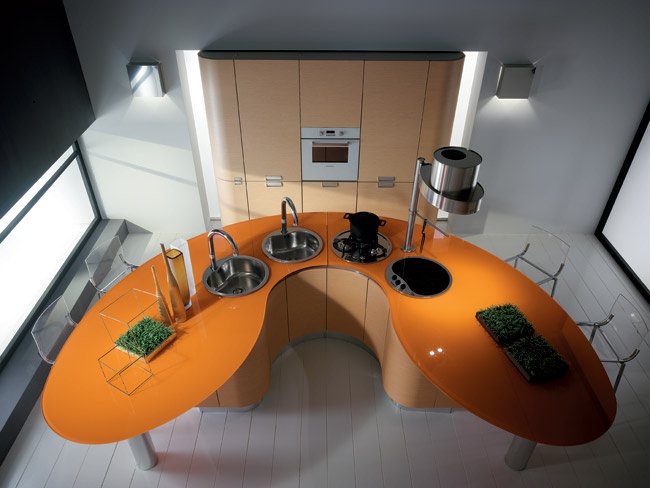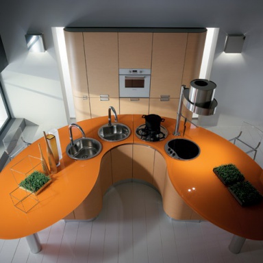 Set for the kitchen from Fiamberti Italian production. The base is made from aluminum. The working area of glass. The surface is treated with varnish from the range of the campaign. Colors: beige, orange.
