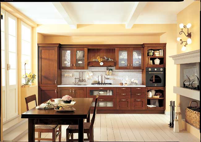 Set for the kitchen from Fiamberti Italian production. Set in a classic style made of solid wood and stone. Door - glass or blind. Accessories drawers and partitions are made of metal. Color - natural wood.