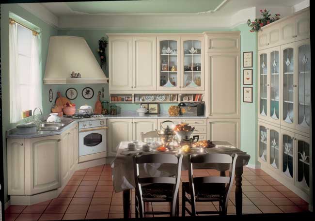 Set for the kitchen from Fiamberti Italian production. Set in a classic style. The frame is made from solid wood. Work area - stone. Door - blind/glass. The surface is treated with varnish from the range of the campaign. Color range: white.