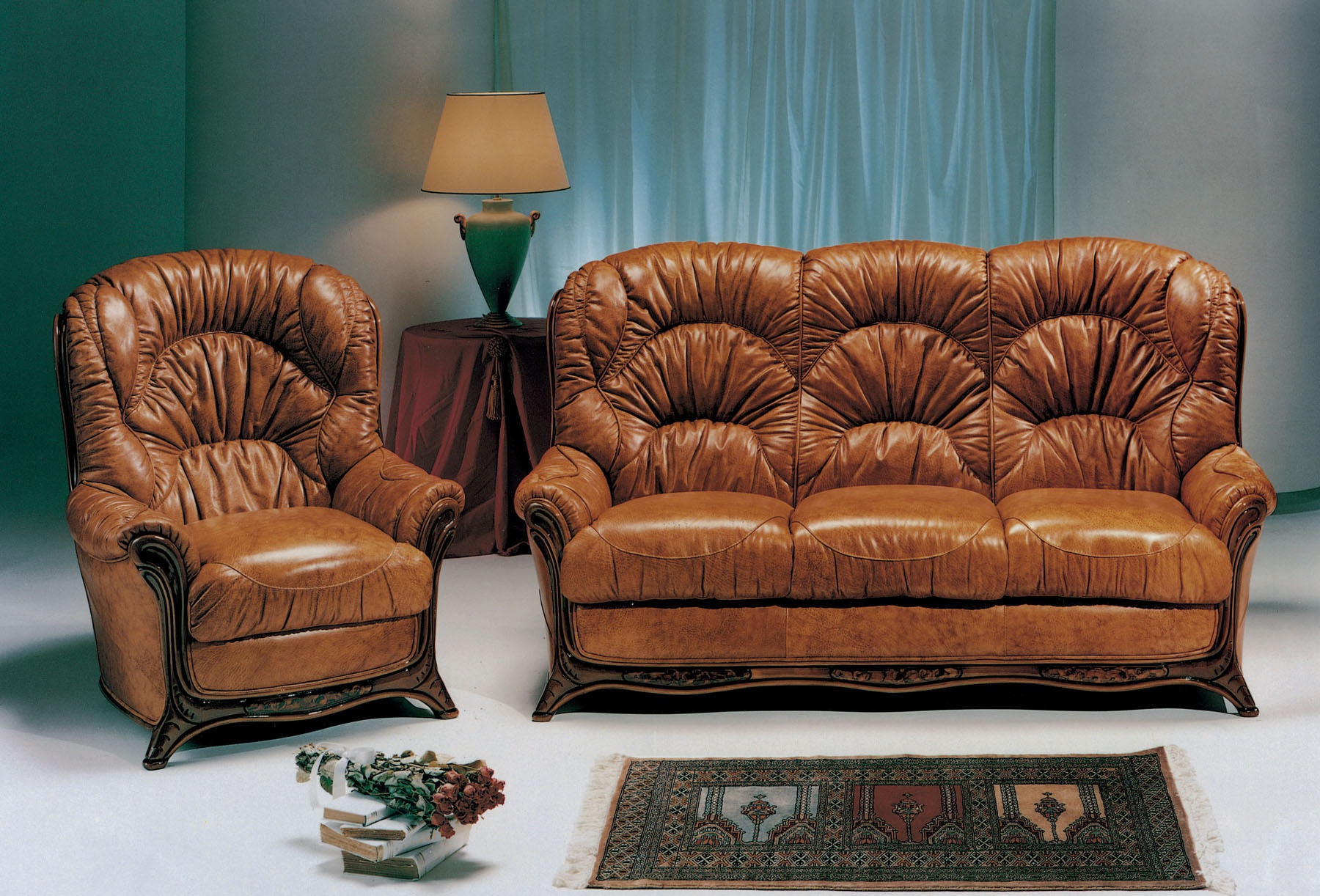 The Palma armchair from the Italian factory RM Arredamenti, a collection of Novalinea. The frame is made from solid wood. Upholstery leather of shiny brown leather. The model is decorated with ruffles. Filler – foam of different density. Wooden elements painted, carved. The chair is made in a classic style.