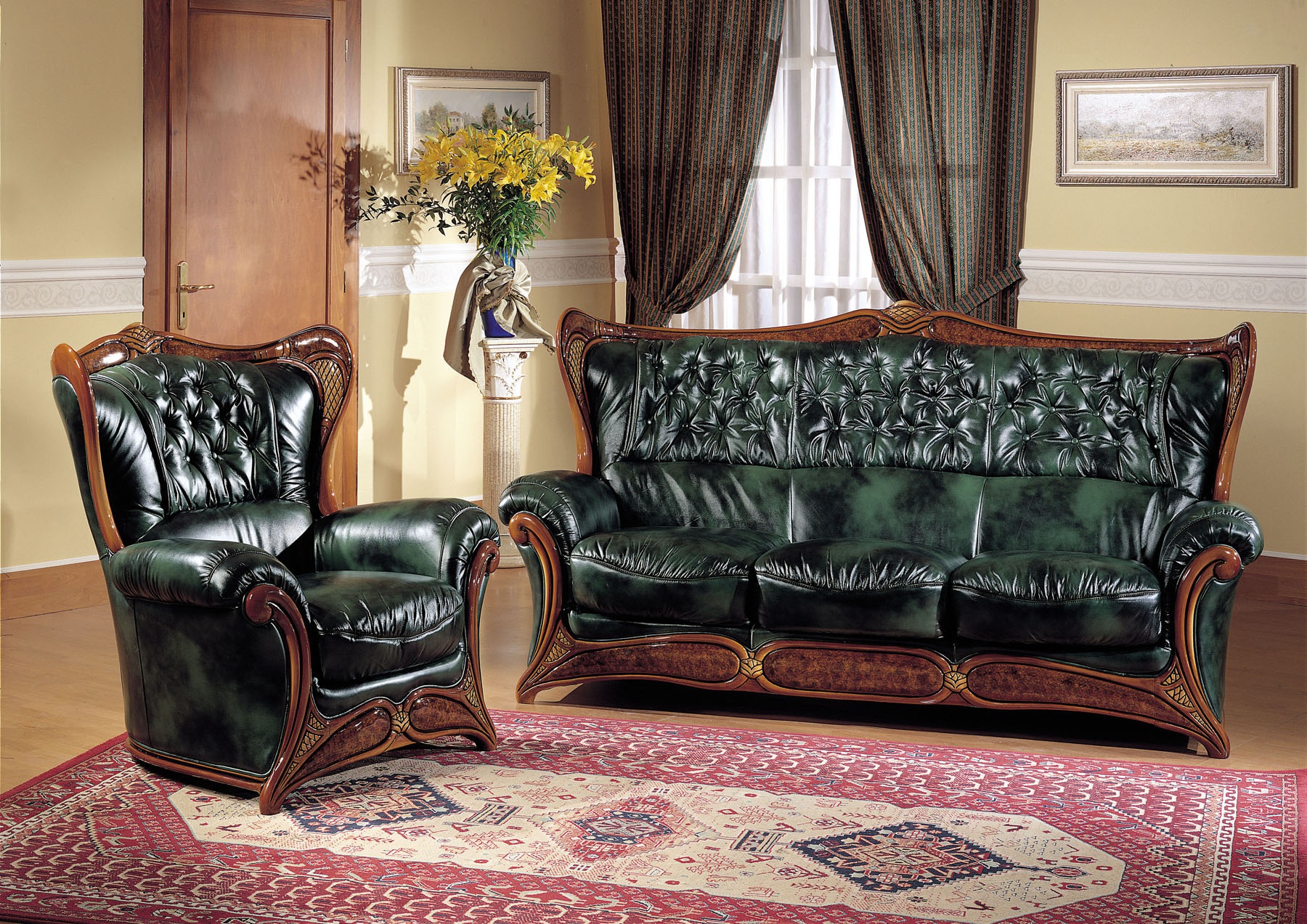 The Alex chair is produced by Italian company RM Arredamenti, a collection of Novalinea. For manufacturing the frame is made from solid wood. Frame lacquered, brown color, decorated with carvings. Upholstery leather or leather substitute, dark green color. Filler – polyurethane foam. The model is decorated with stitch, executed in classical style.