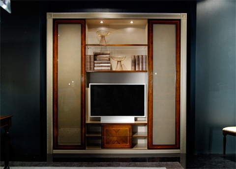 Wardrobe from the Italian Ottocento Medea manufacturer. The product is made from solid wood and glass. Model book with space for TV will decorate the living room in a classic style. Colors: brown, natural color of the wood.