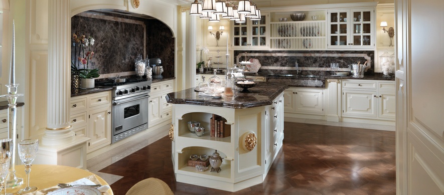 Kitchen from Italian manufacturer Laboratorio Italiano. The headset frame is made of solid wood. Colours - lacquer black and grey. Fittings - metal.Countertops made of marble. Set is made in classic style with carved elements and decorative columns.