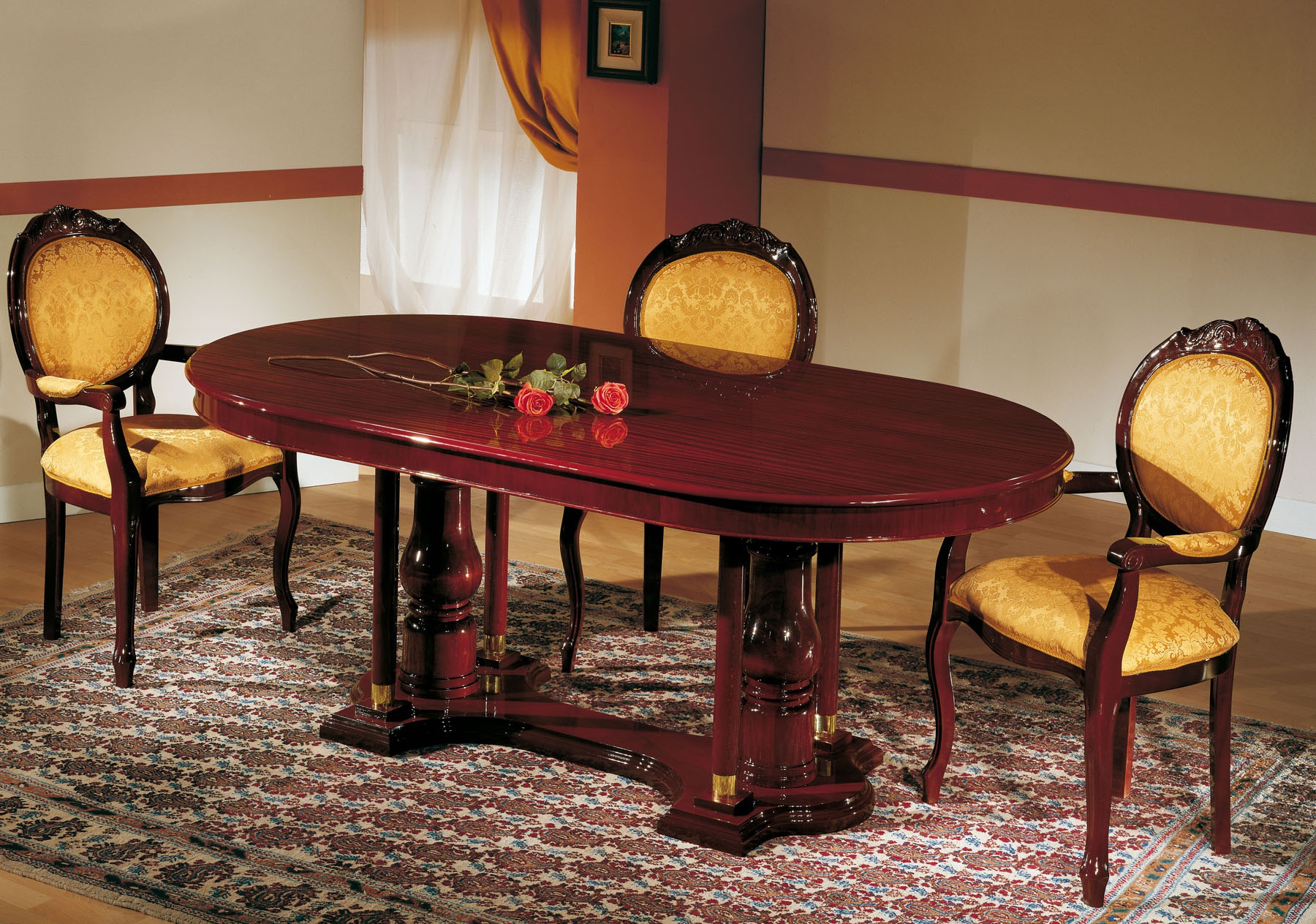 Emma dining table from the Italian factory RM Arredamenti, a collection of Novalinea. The frame is made from solid cherry, lacquered surface. Oval table top, on legs-columns. The model is decorated with hand carved and metal accents Golden color. The product is executed in classical style.